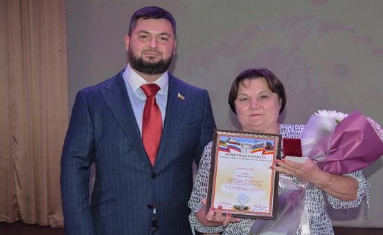 Николай Черкезов вручил Почетную грамоту Законодательного Собрания области нагрудный знак Ростовской областной организации Профсоюза «Наставнику Героя» Любовь Бойко.